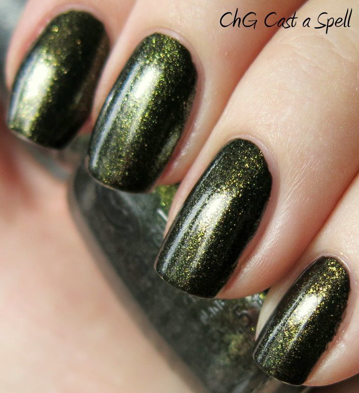 ChG Cast a Spell is from the 2012 China Glaze Halloween collection, the name of which slips my mind. This is a lovely dark green base with lime/yellow-green glitter / glass fleck type shimmer. As expected, it is lovely in the sun, although my camera wasn't able to capture just how shimmery and sparkly it really is. In low / indirect / indoor light it still has an interesting finish, as the lighter colored particles add a lot of depth and texture. Application was a dream, and it is highly pigmented so this was only 2 coats. If you can still find this one I'd definitely recommend picking it up! >^..^<