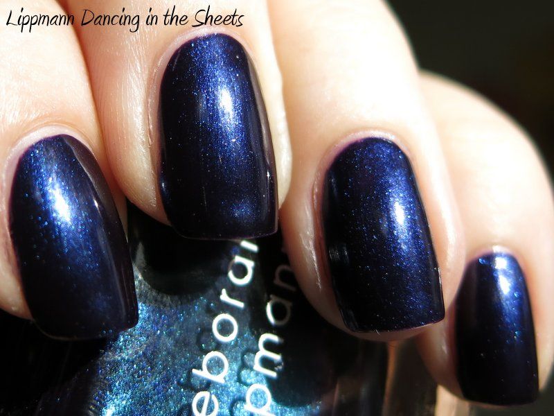 Lippmann Dancing in the Sheets is from the HSN exclusive Footloose (the movie) collection. It is a dark indigo, and really reminds me of the color of blue ink in a ball point pen! It has a slight purple duochrome with turquoise shimmer in the bottle, but on the nail the colored shimmer and duochrome are not very visible. I think you can catch a little of the purple in one of the pics below, but don't count on seeing it in real life. Application good, as with most Lippmann's - nice consistency, easy to control (love the brush), with minimal streaking and great self-leveling. It isn't a terribly unique color, but it's right up mu alley, and I really like it! Enjoy - >^..^<