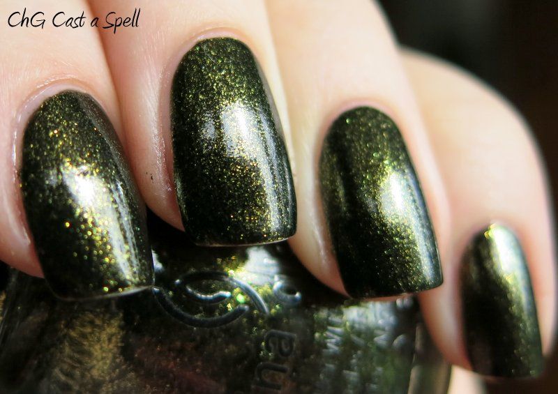 ChG Cast a Spell is from the 2012 China Glaze Halloween collection, the name of which slips my mind. This is a lovely dark green base with lime/yellow-green glitter / glass fleck type shimmer. As expected, it is lovely in the sun, although my camera wasn't able to capture just how shimmery and sparkly it really is. In low / indirect / indoor light it still has an interesting finish, as the lighter colored particles add a lot of depth and texture. Application was a dream, and it is highly pigmented so this was only 2 coats. If you can still find this one I'd definitely recommend picking it up! >^..^<