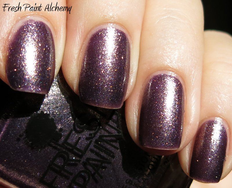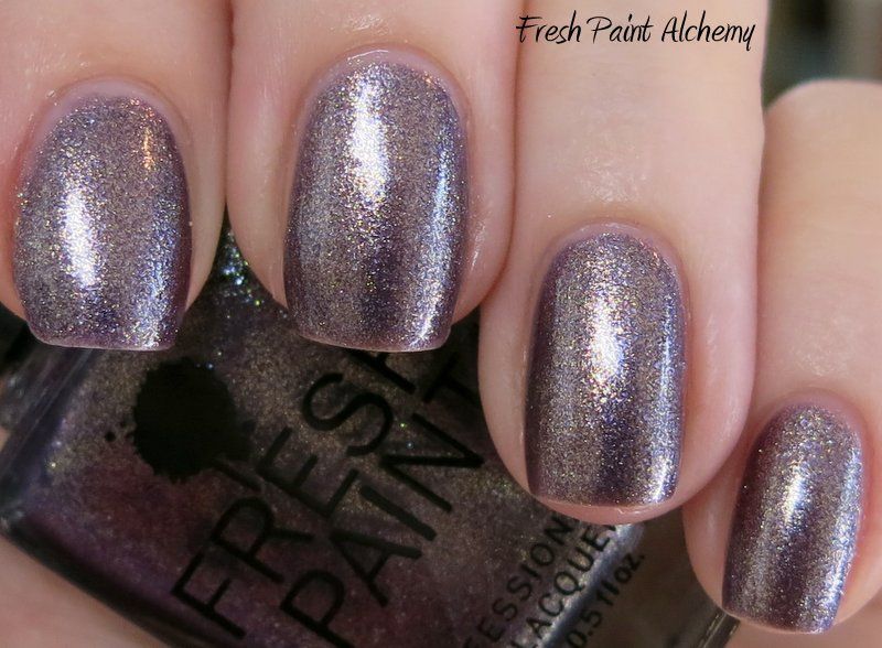 So today's NOTD is a little break from the Halloween theme (yesterday I wore ChG Fortune Teller, which I posted about last year here: ChG Fortune Teller, but I didn't bother to take new pics or post again on it). Today I'm using a brand called Fresh Paint, which I've only seen at 5 Below. They had a 3-for-$5 deal, so I picked up this one, Alchemy, as well as Nebula (wine sparkle) and Sugar Crush (flakies, a la SoTT, HT). Alchemy is a dusty lavender purple with insane gold shimmer. It's a foily finish, and was very easy to apply. I don't hold out high hope for bargain basement polishes, but I have to say I'm impressed - nice consistency, easy to control with the excellent brush, and was completely opaque and not streaky at 3 coats. You can see the detail of the shimmer more easily in the indirect shots, but the gold just comes alive in the sun. It's very pretty, and a nice quality for the money! Enjoy - >^..^<
