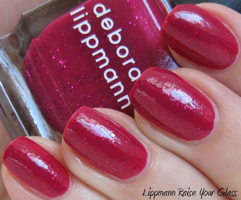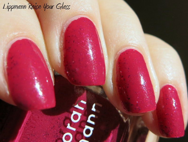 Lippmann Raise Your Glass is a Canadian exclusive celebrating the 175th anniversary of Holt-Renfrew department stores, in the store's signature fuchsia / magenta color. It is a deep fuchsia creme / jelly hybrid with scattered pink glitter particles. Application was ok - not as good as most Lippmann's I have - it is a tad thick and very pigmented for a crelly, but it did tend to streak a bit, so I used 3 coats here for full opacity and depth of color. It dried with a slightly matte finish, and was quite lumpy - I used Gelous and Poshe here, and you can still see the variations in the finish. I'm honestly disappointed, as my expectations were higher for more glitter presence - it didn't "pop" in the sun like I was hoping; I think the sparkle is actually more visible in indirect light. I love colors like this, and I had high hopes, and although I like it, it's not love. Sorry Deborah - >^..^<