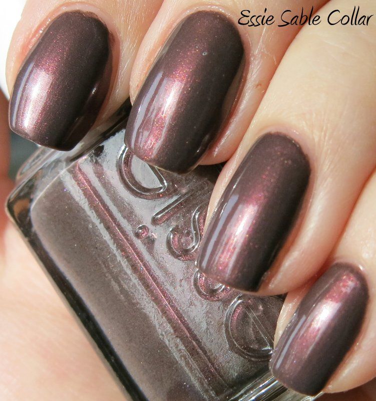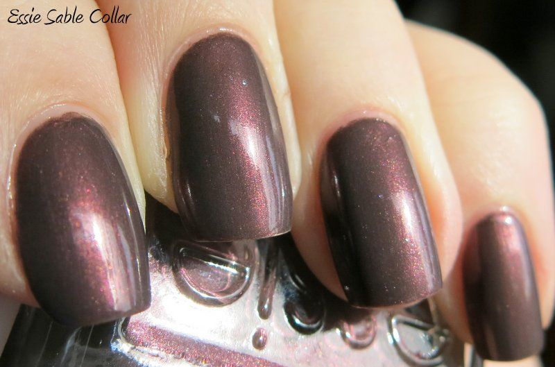 Essie Sable Collar is an interesting color from the Fall 2013 collection. It is a murky grey-brown base with a pink-leaning shimmer - very hard to describe. Application was ok - the formula was a bit thin and somewhat sheer, and I got a little cuticle drag on some nails, but it built nicely in opacity and self leveled so there were no obvious bald / thin spots. It really comes alive in the sun - the pink-ish shimmer is gorgeous, but it falls a little flat in indirect lighting, turning into a murky plummy brown. It seems a perfect color for fall, and I'm glad the sun came out for a little bit so I could enjoy the true beauty of this one! Enjoy - >^..^<