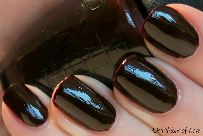 OPI Visions of Love is from the Holiday 2013 Mariah Carey collection. It is a very dark brown-toned red creme, and it dries darker than it looks in the bottle. Application was ok - nice formula, but as is normal with colors like this it is somewhat difficult to get a perfect cuticle line. I used 3 coats here for full opacity and evenness, as it did streak a tiny bit on some nails. It is very dark, looking almost black at times, especially on this gloomy overcast day. But I like shades like this, so that's not all bad. Enjoy - >^..^<