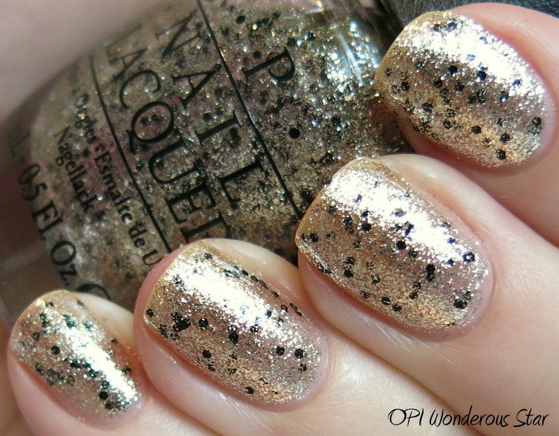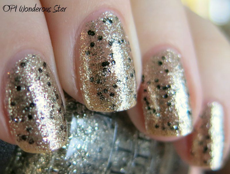 OPI Wonderous Star is yet another color from the Holiday 2013 Mariah Carey collection. It is an interesting champagne gold / silver shimmer / microglitter with black hexagonal glitter that looks like pepper sprinkled on top. Application was nice - it's a tad sheer, so it took 3 coats to be sufficiently opaque for me, but it went on smoothly and was easy to control. It isn't quite gold, but it's warmer than silver... reminds me color-wise of Essie Beyond Cozy, although I'm too lazy to go look at the side by side. :) Enjoy - >^..^<