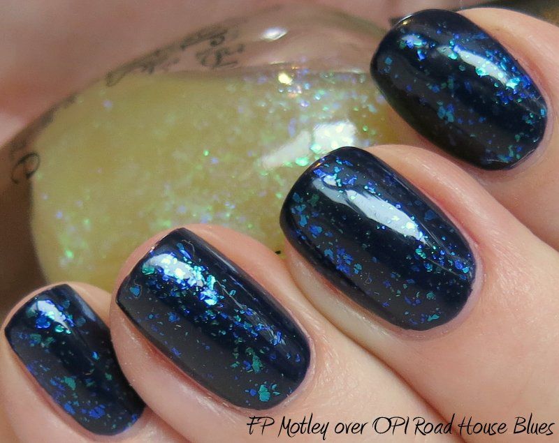 FP Motley over OPI Road House Blues is a favorite combination of mine. RHB is the perfect navy, IMO, and the beautiful blue and green flakies in Motley are a stunning compliment. RHB applied like a dream - great formula, easy to apply, and I only needed 2 coats. Motley is a gorgeous blue and green flakie in a semi-transparent base, which I noticed has yellowed a bit since I got it, but it doesn't show once it is applied over RHB. I like these flakies because they actually show up - distinctly and brightly, so there is no doubt what they are. (I picked up the new FP flakies today, and they are more subtle colors.) Love this combo! Enjoy - >^..^<