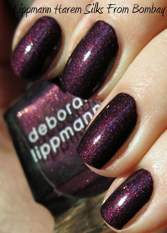 Lippmann Harem Silks From Bombay is from the recent satin finish like which also included Red Silk Boxers and a white one whose name escapes me. This is a full coverage, rapidly drying polish - you have to work really fast, and I still got some streaks and bald spots, so I used a second, rapidly applied coat to even it all out. It dries pretty fast - I didn't use a topcoat at first, then added one the next day. It has a nice satiny matte deep eggplant finish with pink shimmer that is seen more as a glow in the matte version, but OMG look at what happens when you add topcoat! Holy cow. This is probably the most stunning thing I've seen in a long time. The sparkles just come alive - so small and shiny, almost like Clarins 230 or Max Factor Fantasy Fire but without the duochrome effect. Seriously - you need this one. Enjoy - >^..^<