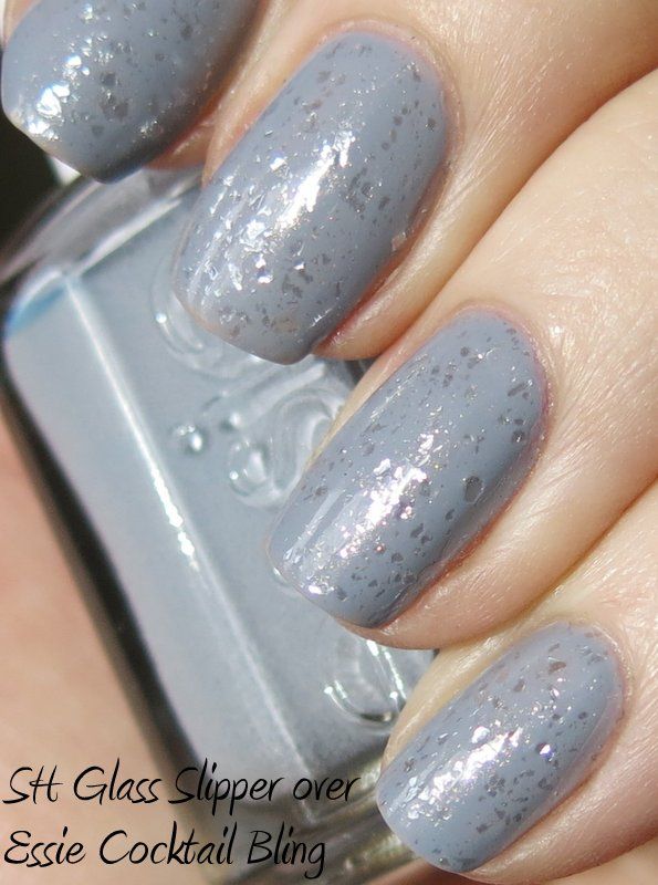 Cocktail Bling is a grey-blue creme that has been out for a few years now, and Glass Slipper is maybe a year old? I forget. :) Application of the Essie was nice - good formula, easy to control, a tad streaky on the first coat, but was completely opaque and even at just 2 coats. Glass Slipper went on well - I only used one coat and was able to get even distribution of the flakes without any trouble. I like this combo - kind of subdued, but interesting at the same time. Has kind of a lacey feel - or maybe snowflakes.... Enjoy! >^..^<