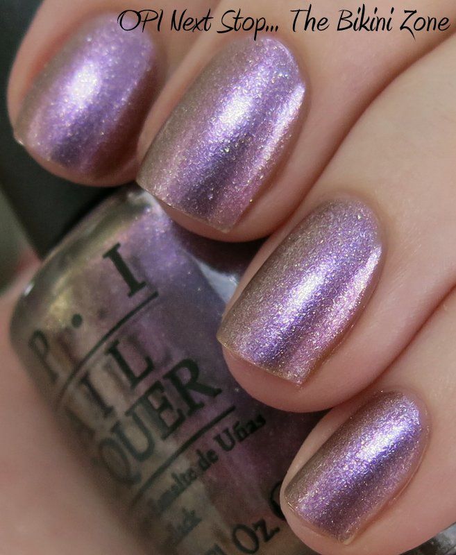 OPI Next Stop... The Bikini Zone is from the new spring 2014 Brazil collection. It is an interesting color - kind of a lavender with a pink tone and a slight duochrome effect with silver sparkles. Application was nice - the first coat was a little sheer but it built nicely in opacity with no cuticle drag and minimal streaking, was easy to control, and there were no problems with the formula. It's definitely more of a spring color, and I think it will fit the bill perfectly in about April! Enjoy - >^..^<