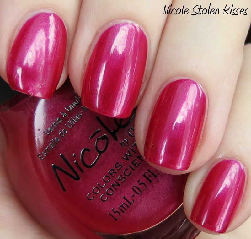 Nicole Stolen Kisses is a color I've had for many years now, and it's always on the verge on the purge pile. It is a slightly frosty, soft metallic shimmer, but it isn't brushstrokey at all. Application was nice - good formula, easy to control, and built nicely in opacity with no streaks or cuticle drag. It is a deep rosey red raspberry color, and my camera didn't quite capture it. But - it's the best I could do on this cloudy day. Enjoy - >^..^<