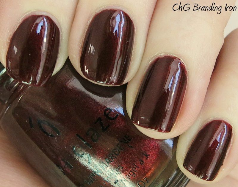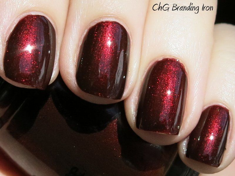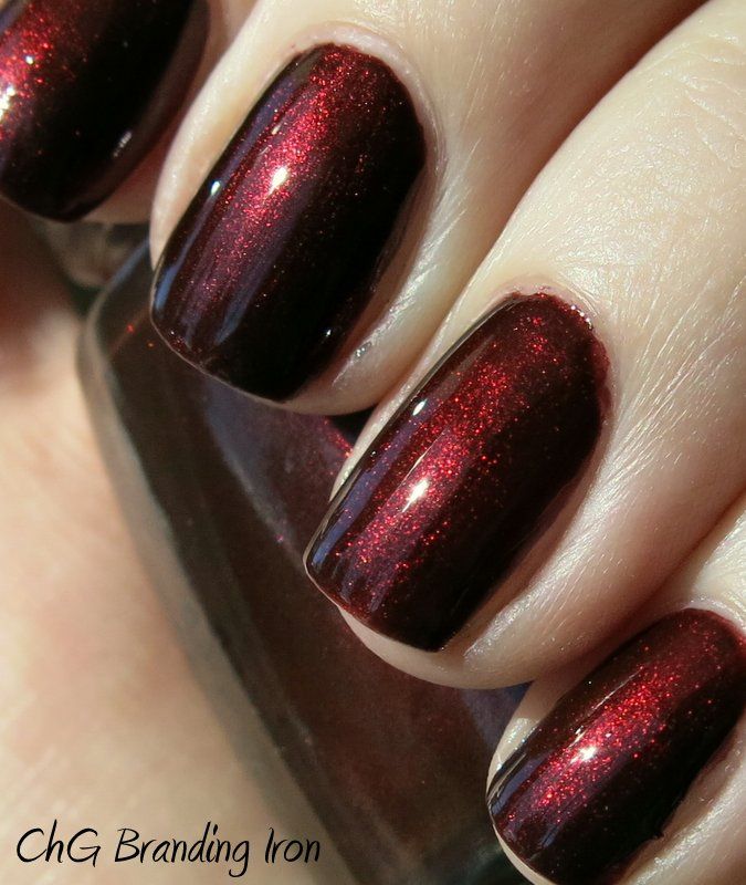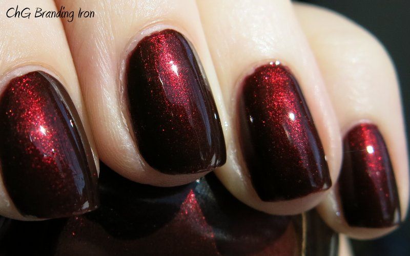 ChG Branding Iron is from the iconic Rodeo Diva collection from 2008.  It is a blackened red shimmer, which pulls very dark in indirect light but is absolutely stunning in the sun!  Application was ok - it was a little hard to control around the cuticle, and it had a tendency toward some cuticle drag, so 3 coats would be ideal for me.  I absolutely adore this polish in the sun - it is so shimmery and glowing, with blackened edges to give it lots of depth and dimension.  It does go very dark in indirect light though, and the shimmer is all but invisible at that point.  So definitely use this on a sunny day!  Enjoy -     >^..^<