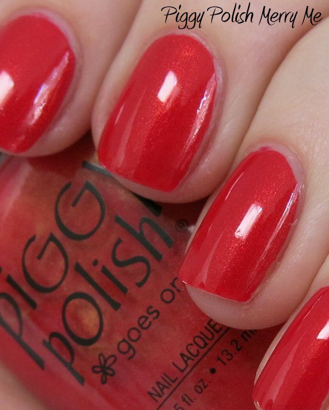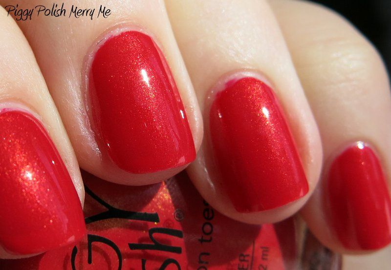 Piggy Polish Merry Me is a color I picked up on clearance at Ulta after the holidays.  It is a bright slightly warm red with gold shimmer.  But the shimmer is much more prominent in the bottle than on the nail, unfortunately.  You can see it easily in direct sunlight, but in indirect light it looks more like a red creme with a slight glow.  Application was good - the formula was nice, no streaking and built to full opacity in 2 coats, but for some reason I had a little trouble controlling it around the cuticle.  I love reds, and I like this one, but I'm not sure it's my favorite red out there.  Enjoy -     >^..^<