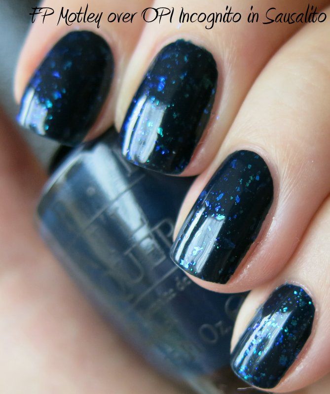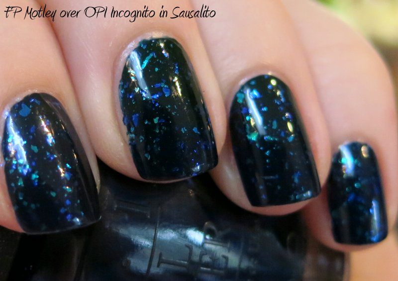 FP Motley over OPI Incognito in Sausalito is a favorite combination of mine. IiS is a dark navy creme, and Motley is a gorgeous blue and green flakie topcoat. Application on both was good - IiS went on smoothly and was easy to control, and was almost a 1 coater. I used 1 coat of Motley here, and it gives IiS a bit of life and depth. Both of these colors are worth owning, and IiS is easy to find - Motley not so much, but it does pop up in blog sales and on eBay from time to time. Enjoy - >^..^<